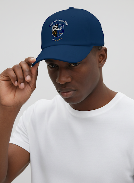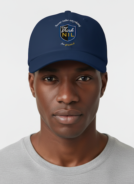 The Think NIL Classic Navy Shield Logo Hat is a clean, everyday essential that keeps the movement right where everyone can see it. Set in a deep navy blue, this structured cap features the Think NIL shield logo centered on the front panel, framed by the arched phrase “Never take anything for granted” above and “for granted” below. The curved brim adds a timeless athletic look, while the low‑profile crown offers a flattering fit for a wide range of head shapes. It’s the kind of hat that feels just as natural in the stands as it does on campus or around town.Built for comfort and durability, this hat is perfect for game days, travel, or casual wear. The breathable construction helps keep you cool, and the adjustable back ensures a secure fit throughout your day. Pair it with hoodies, tees, or performance tops to complete your Think NIL rotation and let the crest serve as a quiet reminder that every opportunity is earned, appreciated, and never taken for granted.