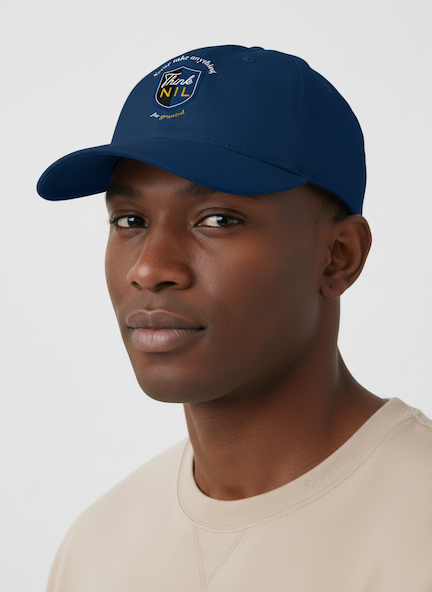 Deep navy hat featuring the Think NIL shield logo and gratitude message on the front, offering a timeless athletic look that works for game days and everyday wear.